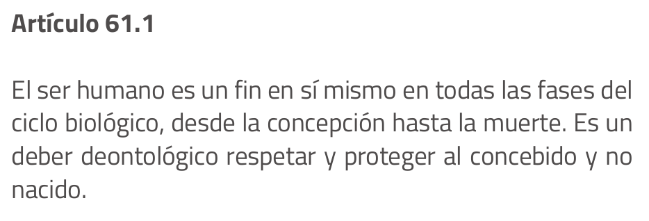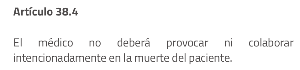 «En el nuevo Código de Deontología Médica se mantiene en su Artículo 38.4 que «El médico no deberá provocar ni colaborar intencionadamente en la muerte del paciente.» y en el Artículo 61.1 dice que «El ser humano es un fin en sí mismo en todas las fases del ciclo biológico, desde la concepción hasta la muerte. Es un deber deontológico respetar y proteger al concebido y no nacido.» El TC y los garantes del Derecho Público están dando la espalda a la Deontología Médica subvirtiendo la Profesión Médica, algo del todo intolerable.»