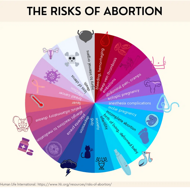 Cáncer de mama: Según AbortionBreastCancer.com, las investigaciones han demostrado “un aumento estadísticamente significativo del 40 % en el riesgo [de cáncer de mama] en mujeres que han tenido abortos”. CompassCare es un centro de atención médica sin fines de lucro en Nueva York, en su sitio se afirma: “Un análisis de 2013 reveló un aumento del 44 % en el riesgo de cáncer de mama entre las mujeres que habían tenido al menos un aborto inducido. El riesgo relativo aumentó al 76 % y al 89 % para aquellas que habían tenido al menos dos o tres abortos, respectivamente”.