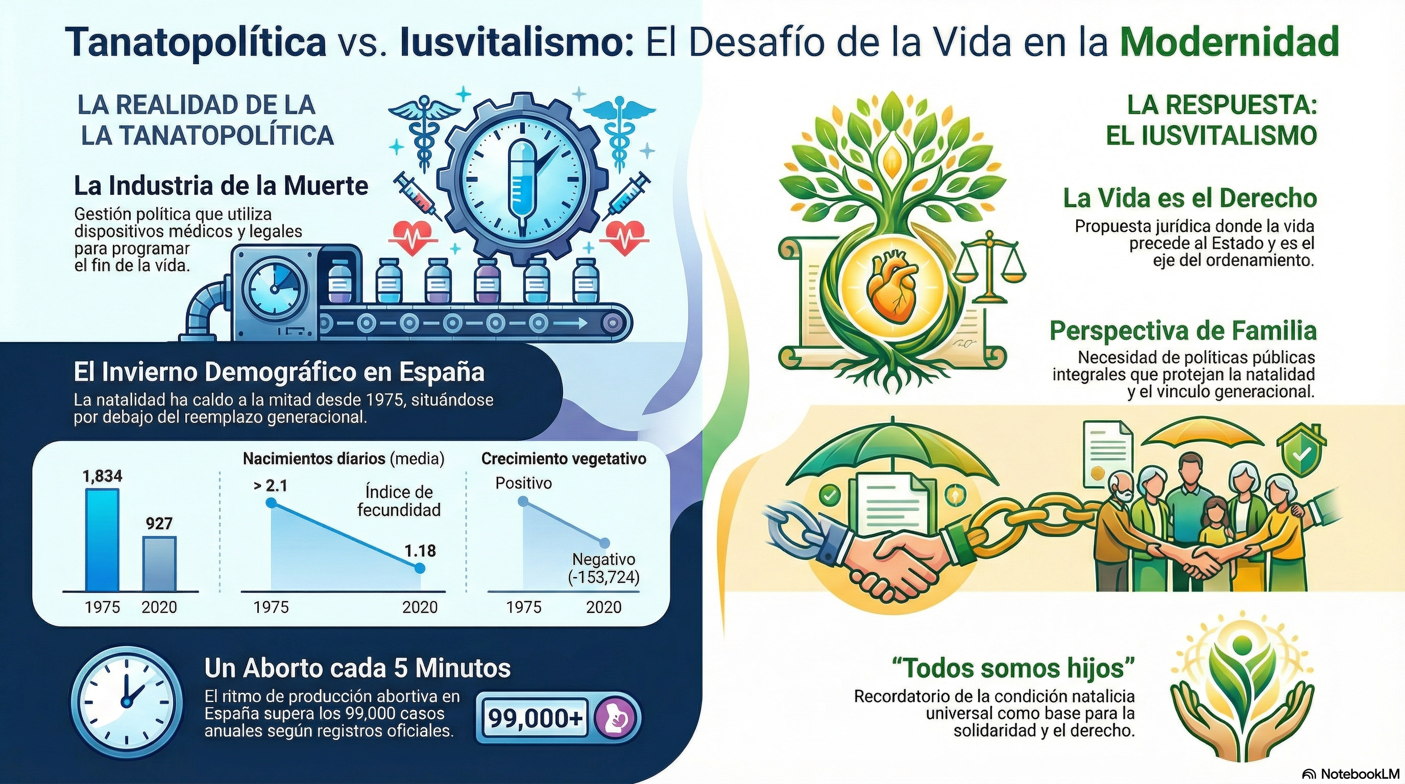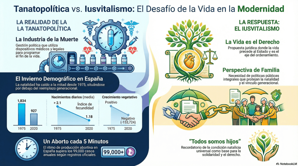 Frente a este horizonte de ceniza, surge el Iusvitalismo. No se trata de una simple defensa legal, sino de un giro copernicano en la filosofía del Derecho: la premisa de que la vida precede al Derecho, no al revés. Esta corriente propone una reinterpretación profunda del Artículo 15 de la Constitución Española, entendiendo que «la vida humana es el derecho mismo«, y no una concesión estatal que el poder pueda otorgar o retirar según el clima político. El Iusvitalismo busca recuperar la autoestima nacional reconociendo la condición de natalidad. Frente al individualismo radical que nos aísla, esta visión nos recuerda que la vida es un vínculo compartido. El Derecho debe volver a ser el cauce que protege la fragilidad humana desde el vientre hasta la tumba, devolviendo al individuo su condición de miembro de una comunidad de vivientes, no de una masa de cuerpos gestionables.