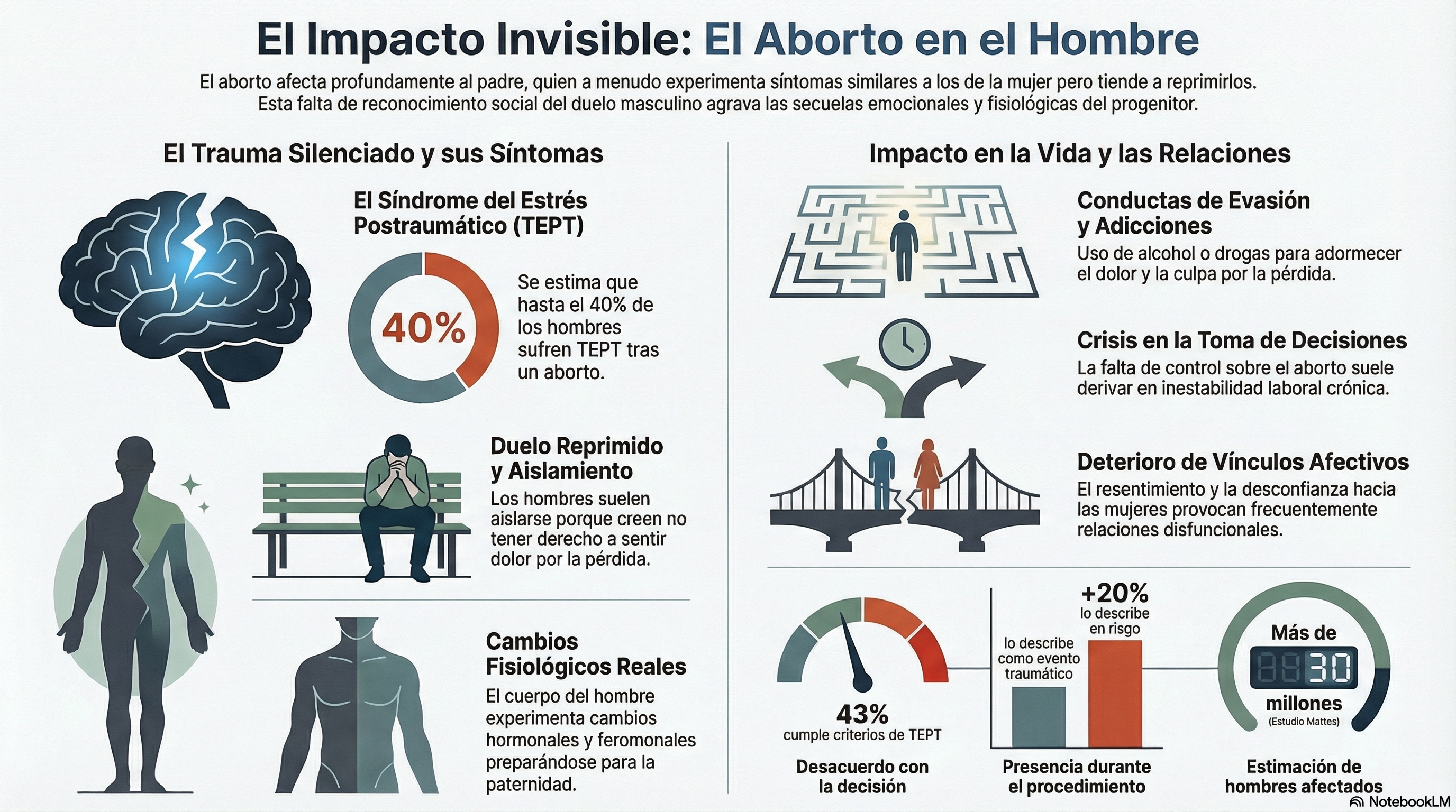 El impacto psicológico en el hombre no debe minimizarse como una tristeza pasajera. Los datos sugieren que se trata de un fenómeno de salud mental con criterios diagnósticos claros. Las investigaciones indican que hasta un 40% de los hombres pueden sufrir estrés postraumático (TEPT) derivado de la experiencia del aborto.