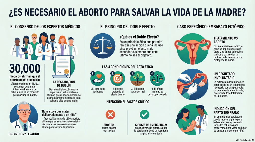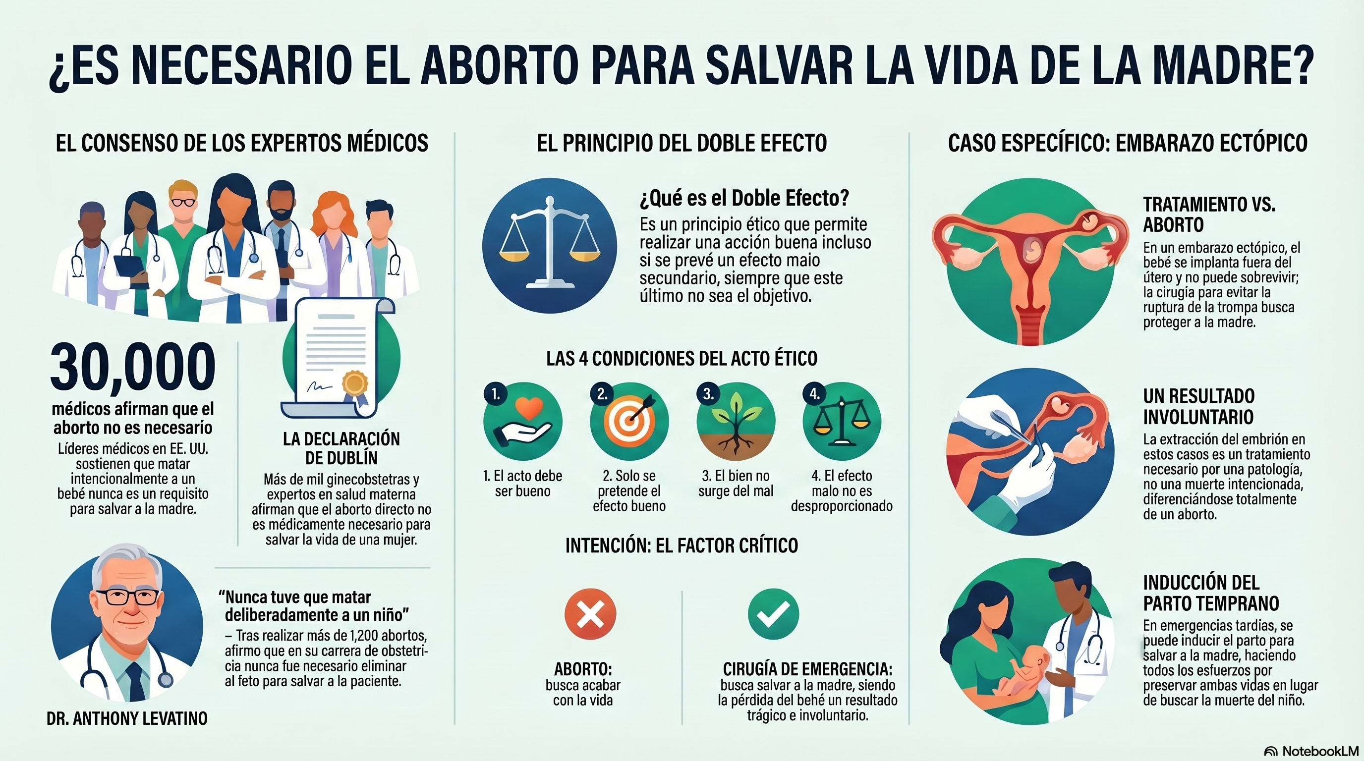 La distinción entre intención y resultado es la piedra angular que permite a la medicina moderna salvar vidas sin comprometer su integridad ética. Los testimonios de científicos y obstetras, sumados a la aplicación rigurosa de principios bioéticos, demuestran que el aborto directo no es una herramienta médica necesaria, sino una práctica que la medicina puede y debe trascender mediante el uso de tratamientos que respeten la dignidad de ambos pacientes.